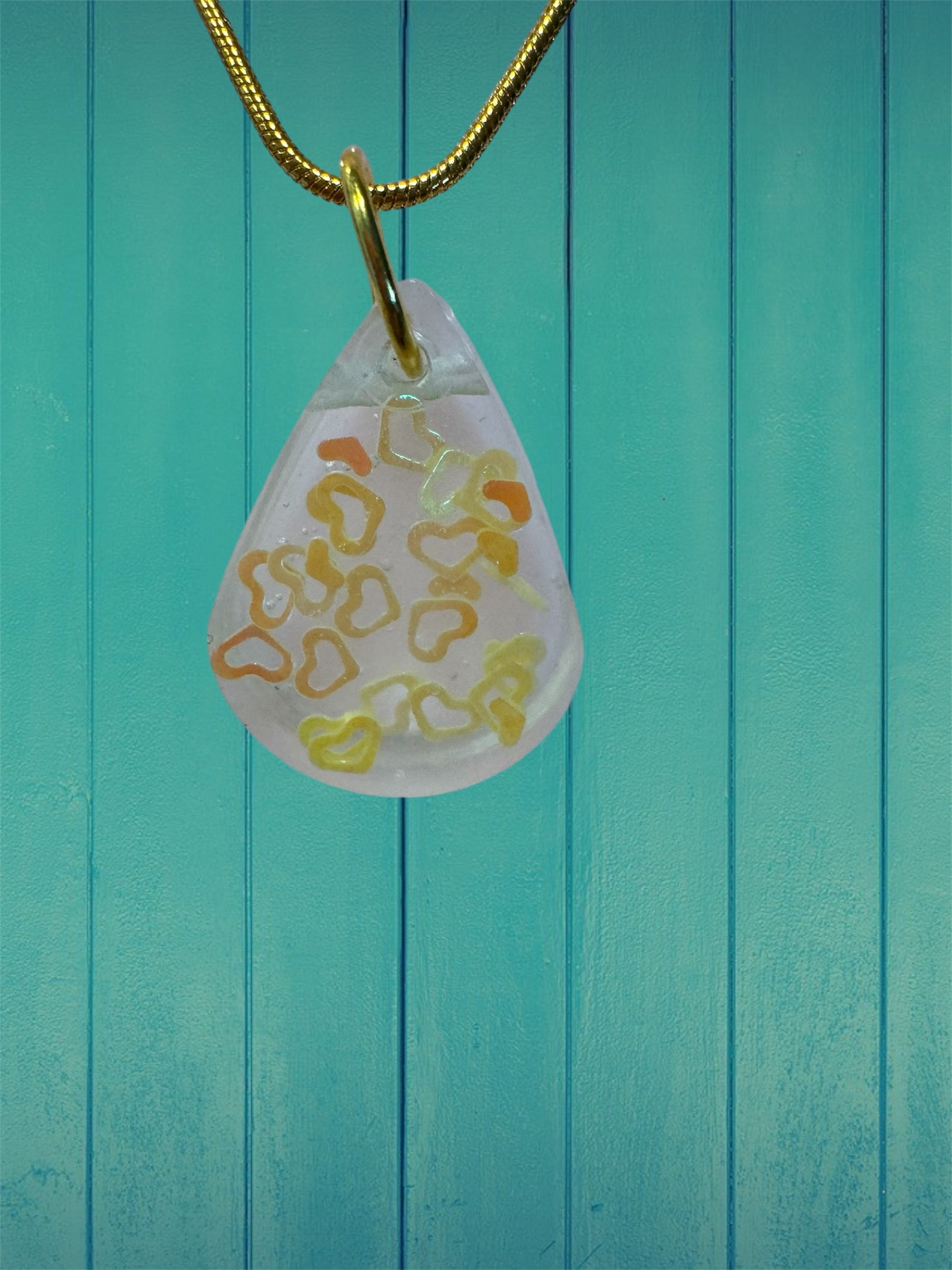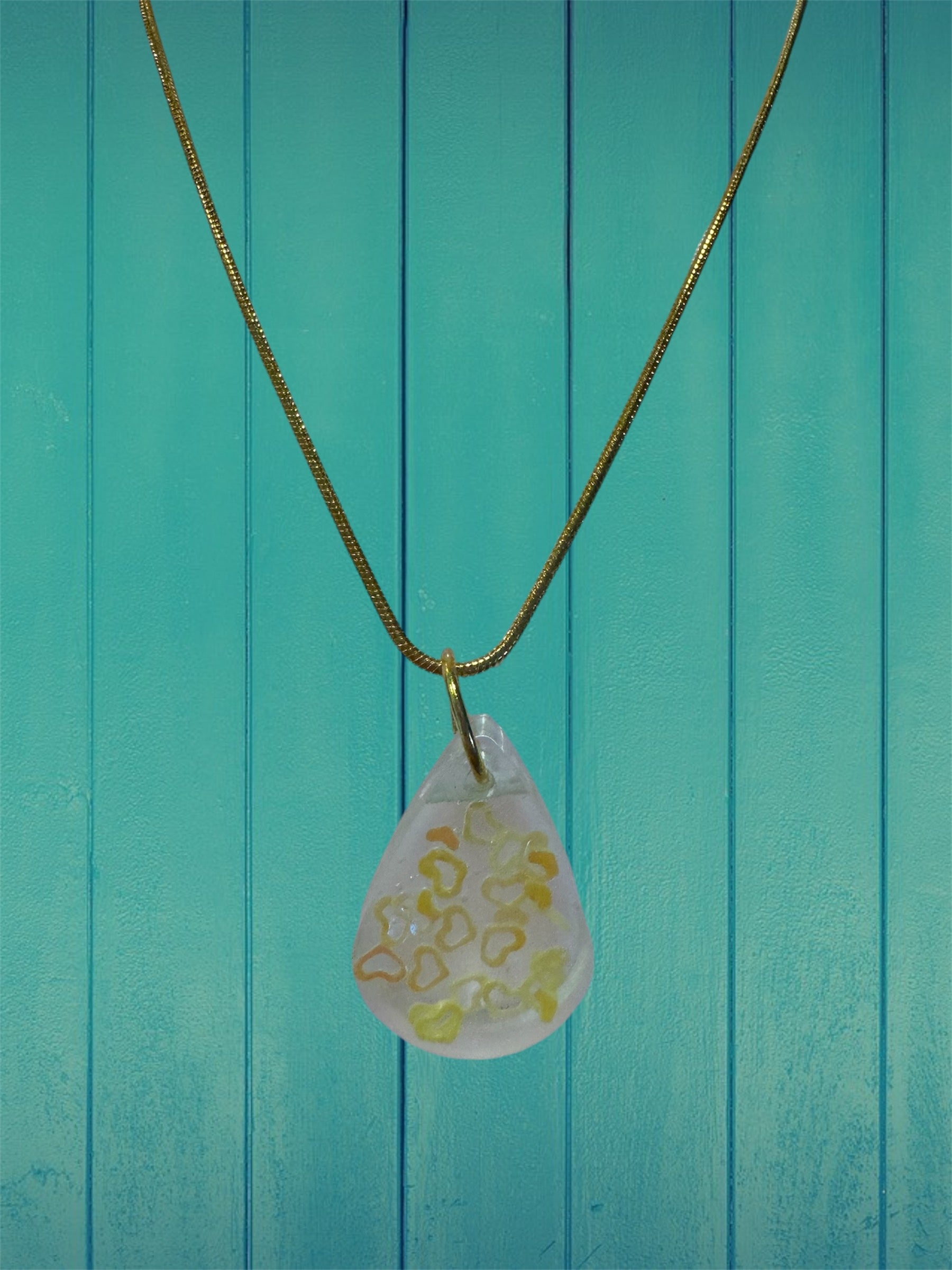 Illuminate your style with this handmade resin teardrop necklace with yellow hearts, gracefully suspended on an 18-inch golden rhodium-plated chain. A perfect blend of elegance and artistry.