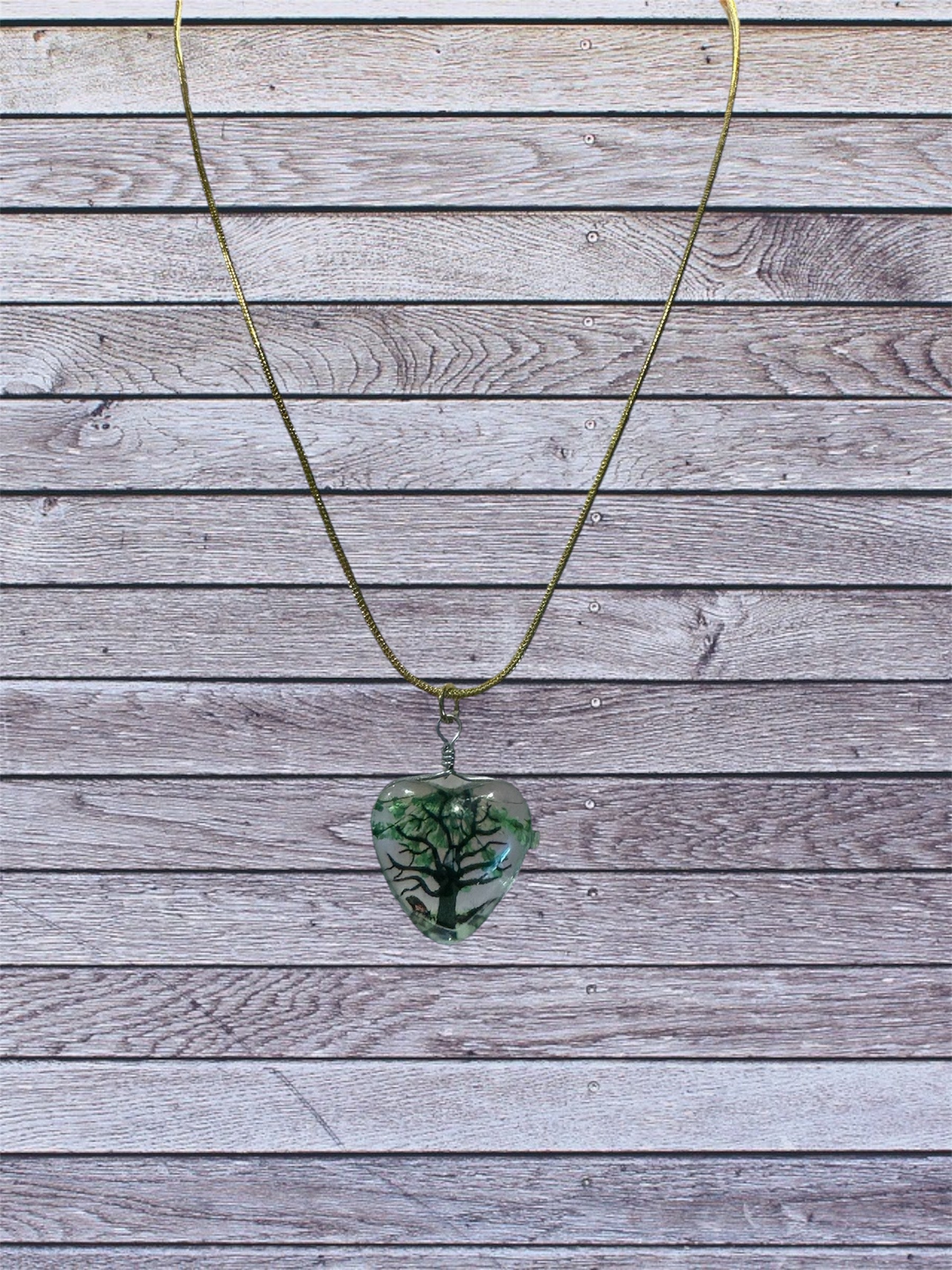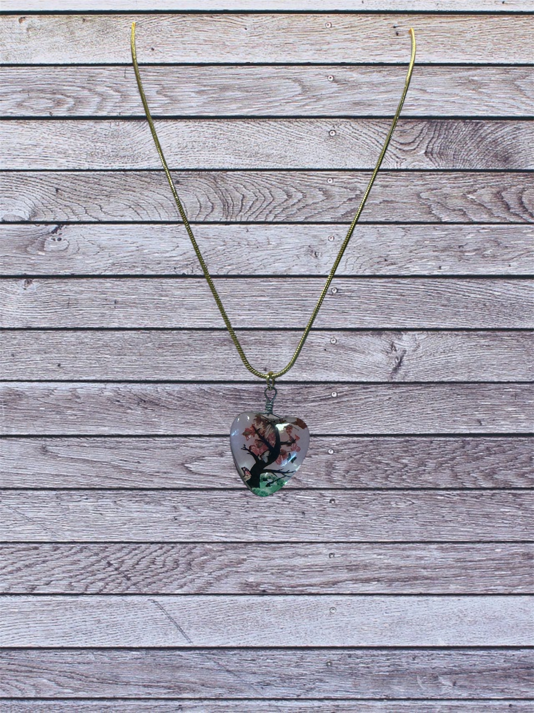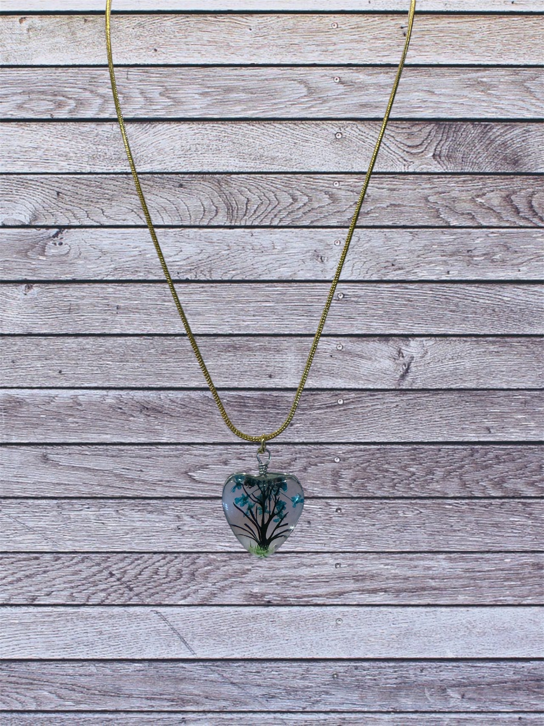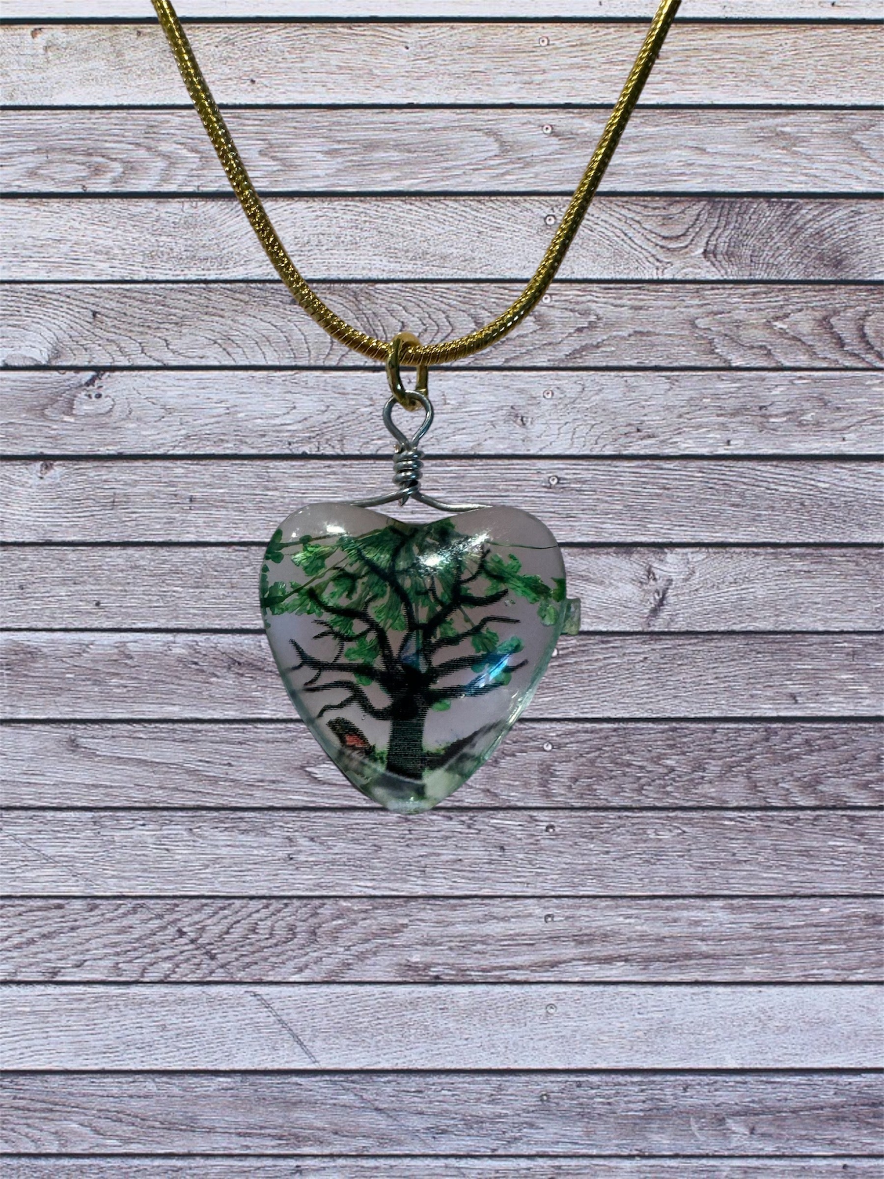 This is a heart-shaped resin Tree of Life necklace on a 18-inch rhodium-plated golden snake chain. It comes in various colors: red, blue and green. The Tree of Life design adds a symbolic touch, often representing growth, strength, and connection.
