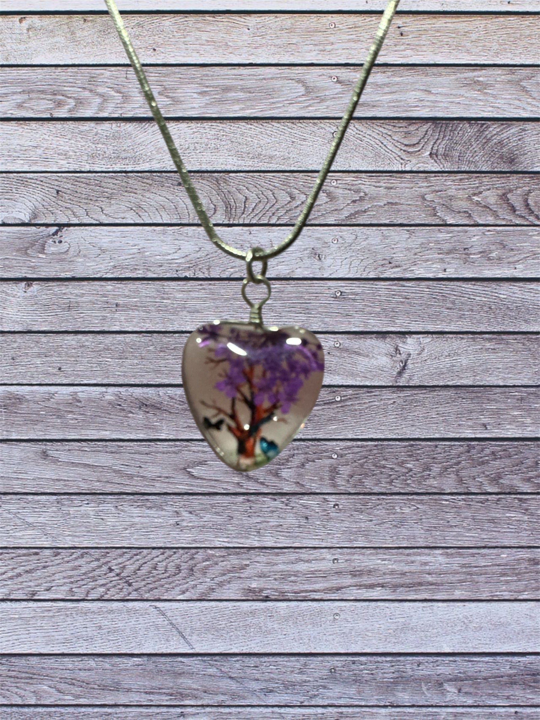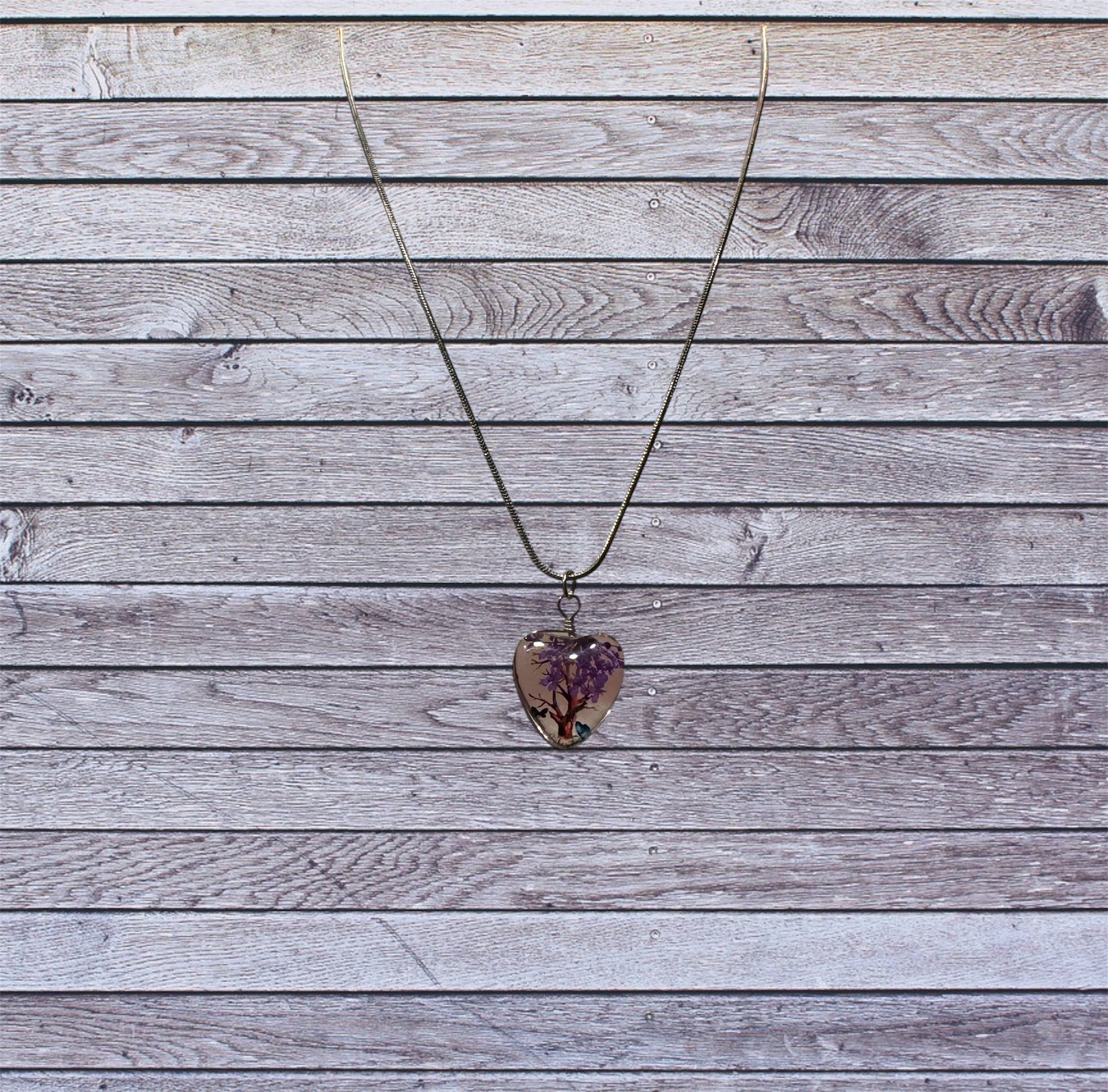 This is a heart-shaped resin Tree of Life necklace on a 18-inch rhodium-plated silver snake chain. It comes in one color purple. The Tree of Life design adds a symbolic touch, often representing growth, strength, and connection.