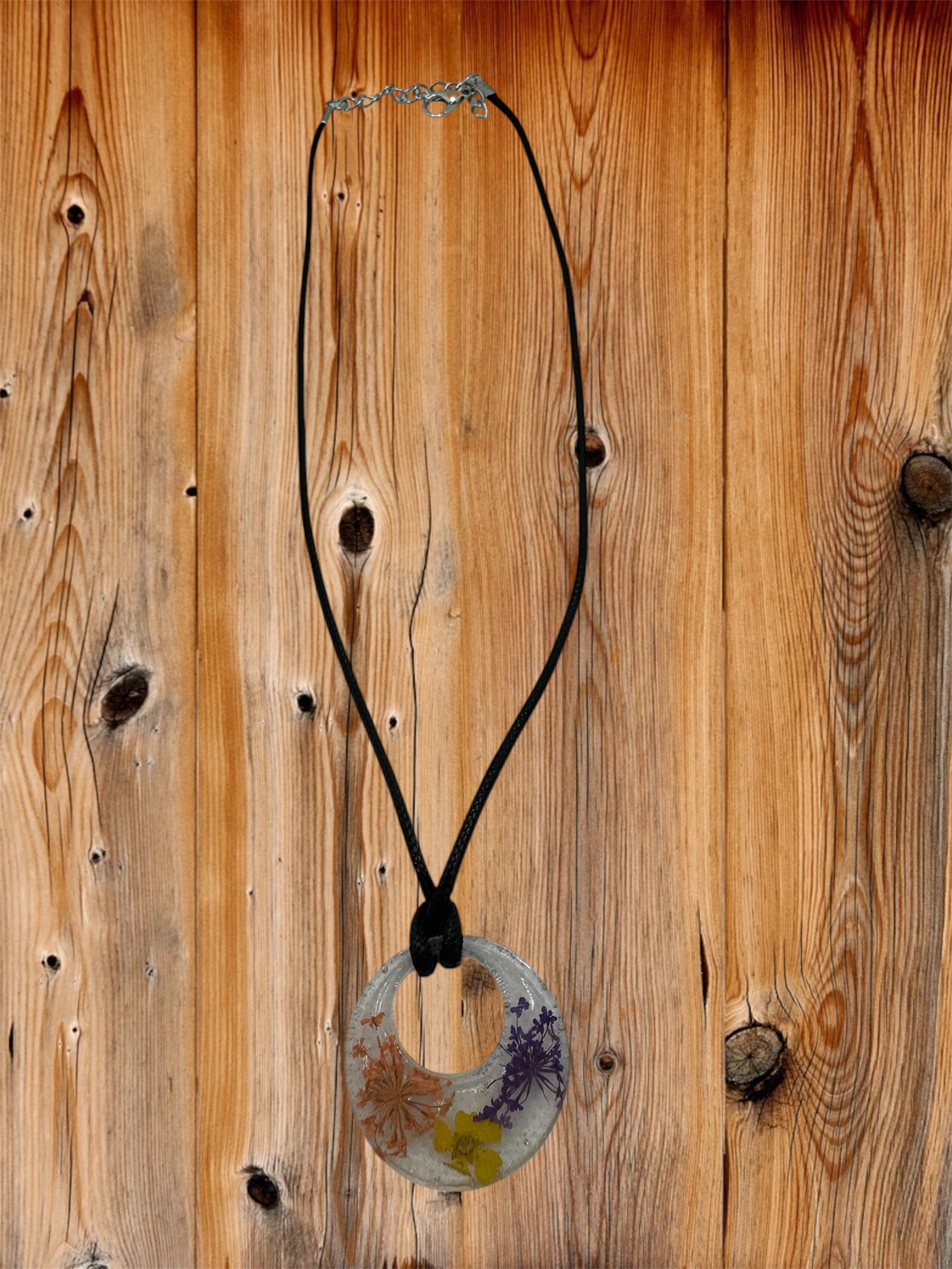 Embrace the beauty of nature with this stunning handmade resin necklace, featuring vibrant yellow, orange and purple flowers, delicately encased in a round shape. Suspended on and 18-inch rope chain, it's the perfect accessory to add a pop of color to any outfit.