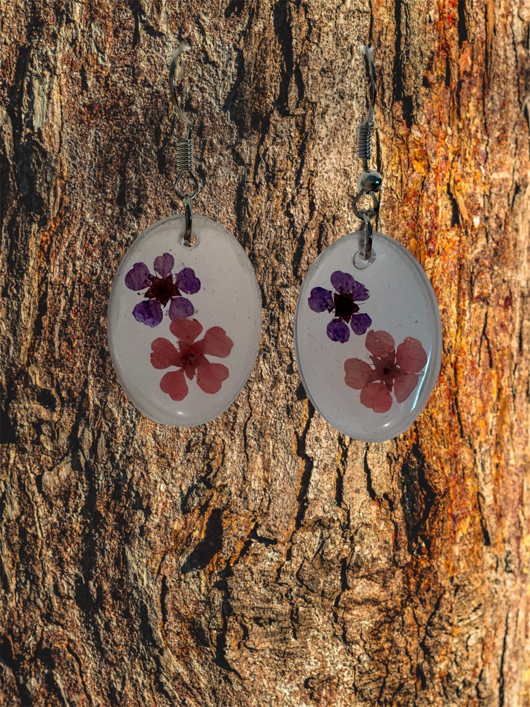 Bring a touch of floral elegance to your look with our handmade resin teardrop earrings, adorned with beautiful pink and purple flowers. Featuring a sleek silver fishhook style, these earrings are a perfect blend of nature-inspired charm and artistic craftmanship!